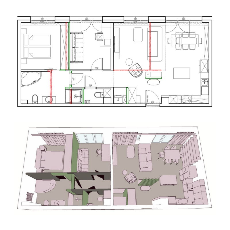 Dostajesz kilka wariantów układu z dokładnym opisem plusów i minusów. Widoki 3D (bez tekstur) pomagają poczuć skalę przestrzeni – żebyś nie był zaskoczony/a później, że salon 15m² to jednak niewiele miejsca.