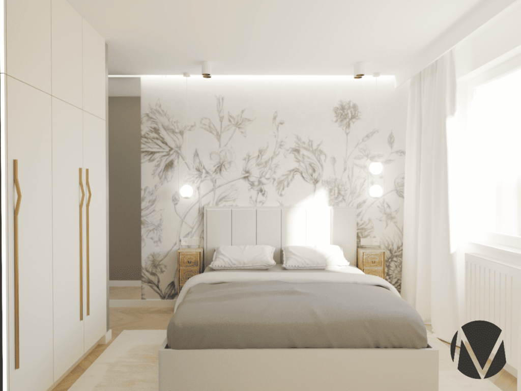 W sypialni zaprojektowałam Piękną tapetę monochromatyczną z rysunkiem kwiatów polnych. Pomimo niewielkich rozmiarów pomieszczenia udało mi się zaprojektować 2 szafy w ciepłym waniliowym kolorze. Dodatkowej elegancji dodają złote uchwyty. Kolorystyka oraz oświetlenie tworzą przytulną atmosferę tego wnętrza.